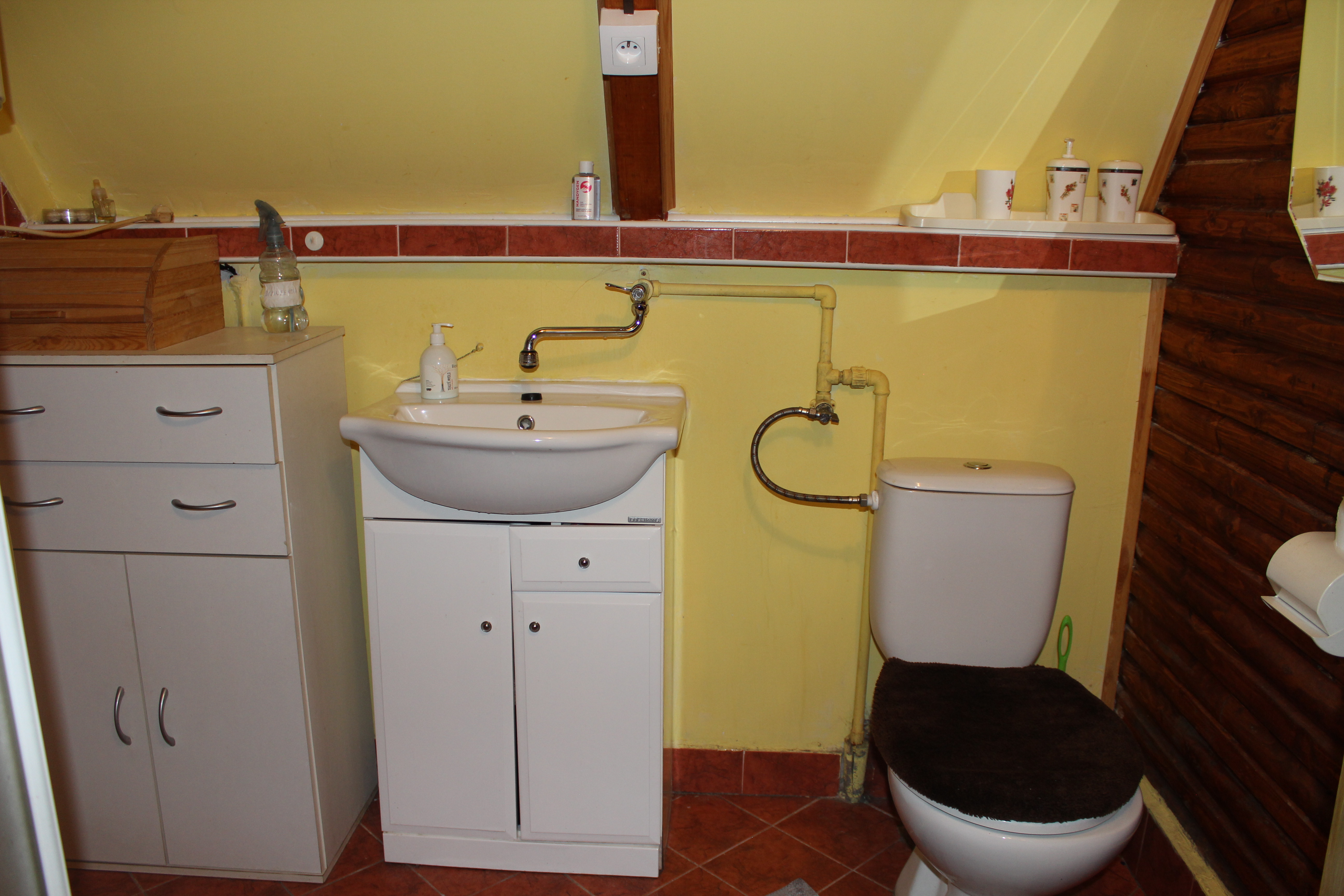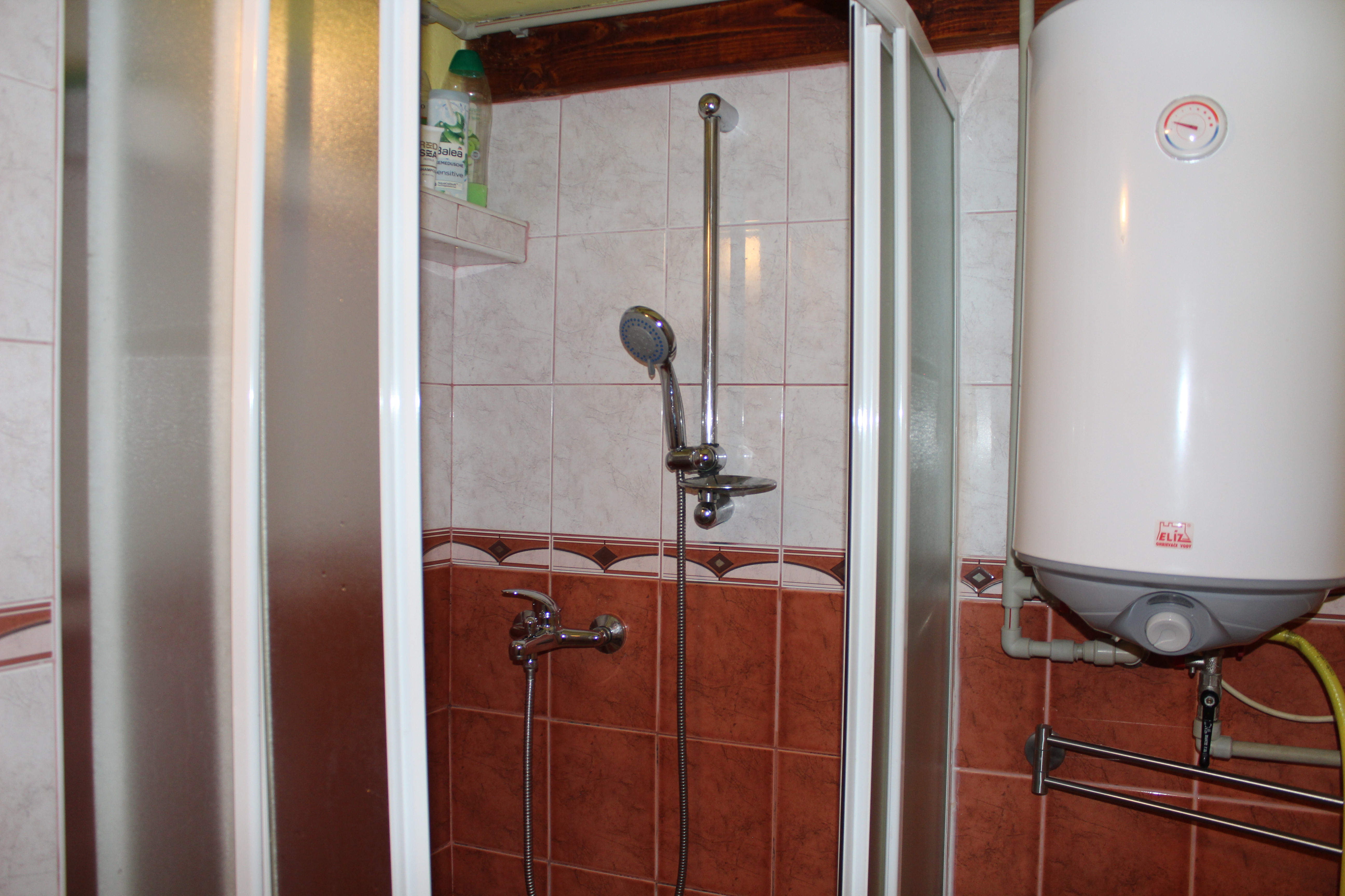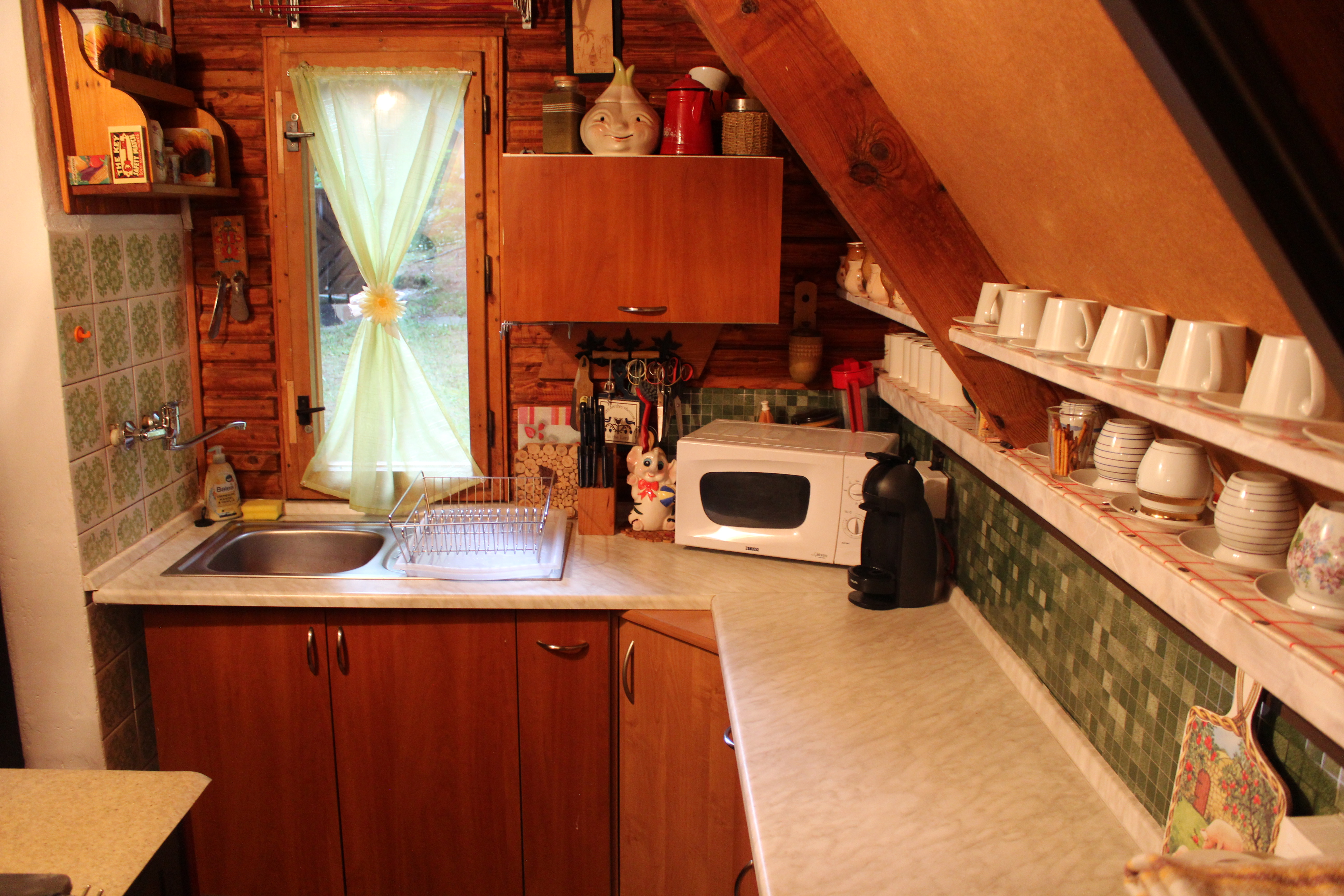 kuchynka s elektrickým varičom, rýchlovarnou kanvicou, mikrovlnnou rúrou, potrebným kompletným kuchynským vybavením aj základnými surovinami. Prízemie dotvára chodbička v ktorej sa nachádza chladnička s mrazničkou a kúpeľňa so sprchovacím kútom a toaletou, kde sú dostupné aj čistiace prostriedky a čisté uteráky.