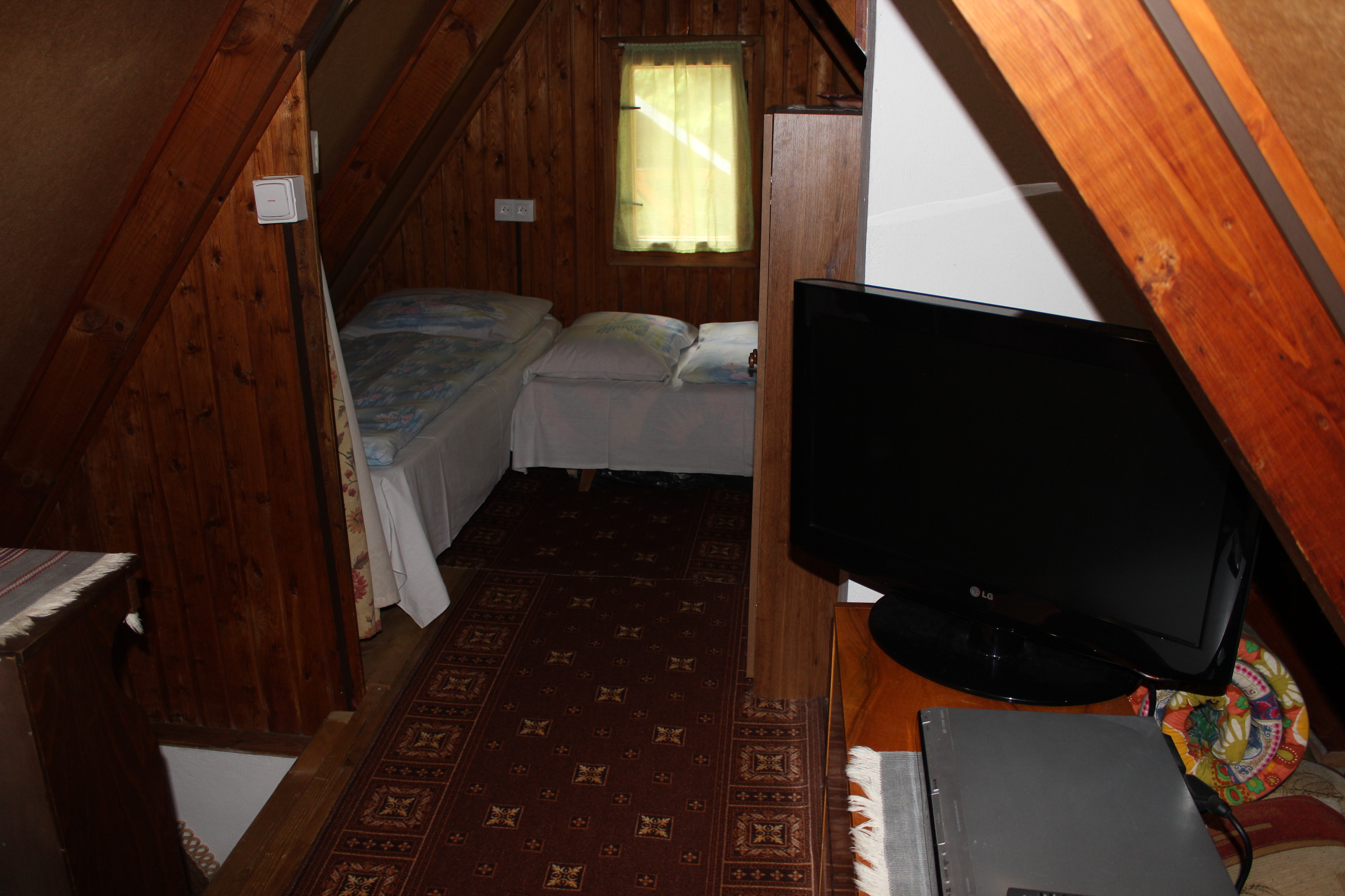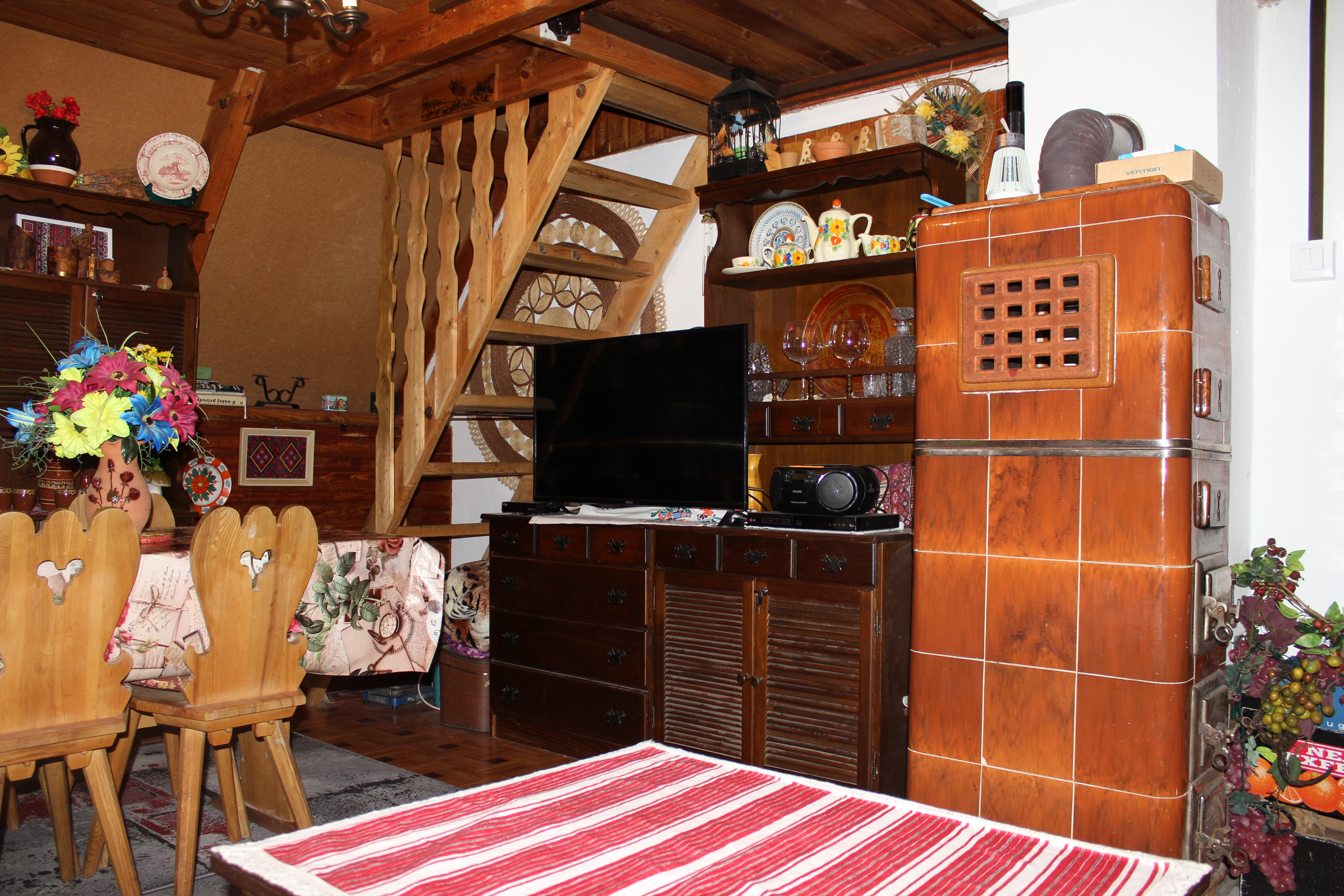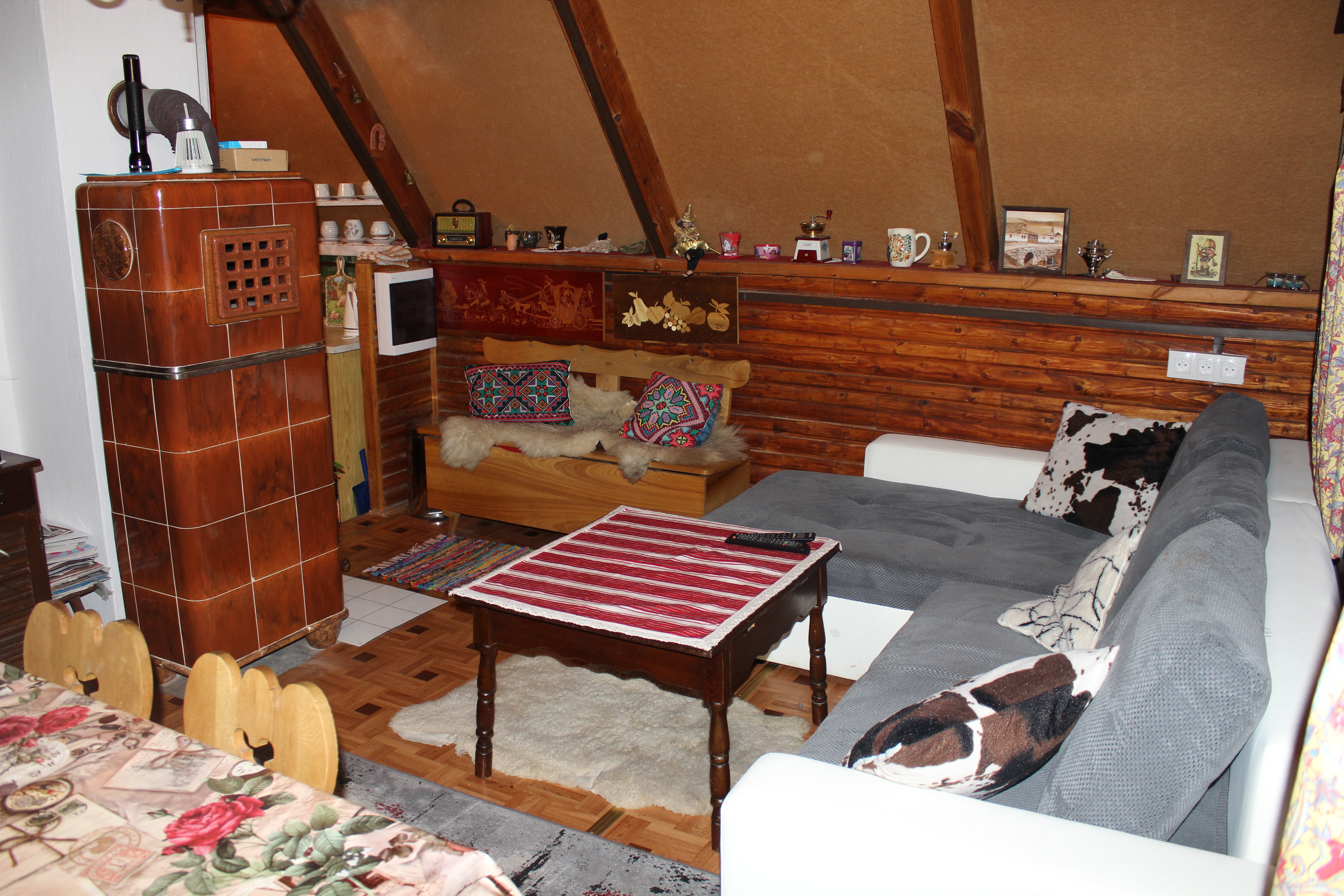 Počas Vášho pobytu je Vám k dispozícii obývacia miestnosť s krbovými kachľami a pohodlnou rohovou pohovkou (na spanie ako dvojposteľová), televízor so satelitným príjmom (slovenské, české aj zahraničné programy), DVD prehrávač s filmami a koncertmi na DVD, rádio s CD prehrávačom.